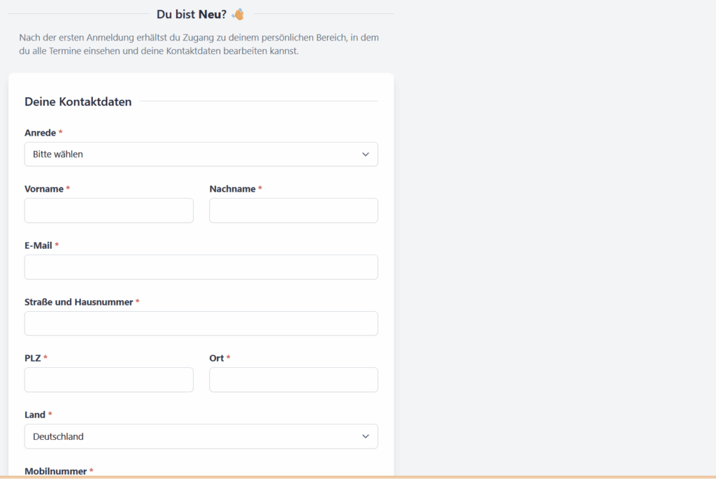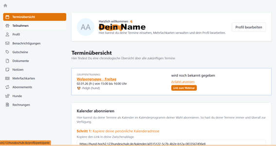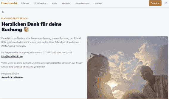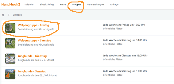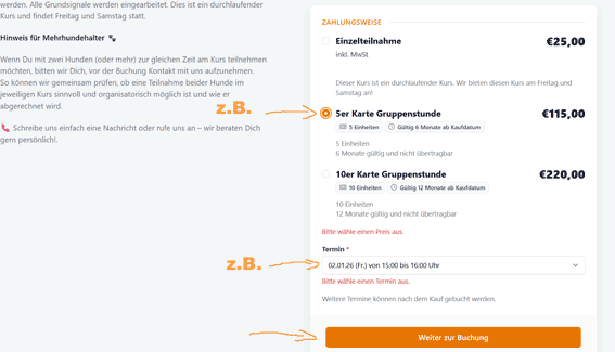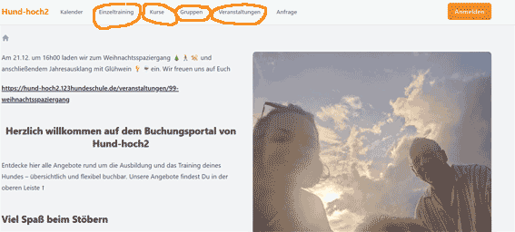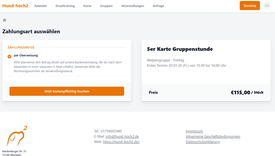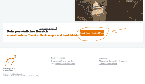 Kann ich mich selbst registrieren? Ja, Du kannst Dich sich selbst registrieren, z.B im Rahmen einer Buchung. Eine Registrierung ohne direkte Buchung, also nur zum Anlegen eines Kundenkontos ist auch möglich, indem Du eine Anfrage stellst, abschickst und dich mit der von Dir hinterlegten e-mail Adresse in „Mit E-Mail Code“ + „Deine E-Mail“ + „Code anfordern“ anmeldest. Du bekommst dann einen Anmelde-Code an Deine E-Mail-Adresse gesendet, die du dann eintragen kannst. Hier hast Du einen eigenen Bereich der nur von Dir einsehbar ist und den Du nach Deinen Wünschen anpassen kannst. Du kannst z.B. ein eigenes Passwort hinterlegen, mit dem Du Dich dann das nächste Mal im Anmeldefenster mit „E-Mail & Passwort“ anmelden kannst. Wir können Dir aber auch auf Wunsch gerne ein Konto anlegen. Wir zeigen Dir hier wie Du dich über einer Buchung anmelden kannst. Du gehst über die Seite Hund-hoch2.123hundeschule.de auf den Reiter Deines Interesses (Einzeltraining / Kurse / Gruppen / Veranstaltungen) im oberen Teil der Seite. Du hast Dich z.B. für die „Gruppen“ entschieden und klicks dann auf das Angebot, das du buchen möchtest. In diesem Fall „Welpengruppe – Freitag“ Nachdem Du auf „Welpengruppe – Freitag“ geklickt hast öffnet sich dieses Fenster, in dem Du aussuchen kannst ob Du eine einzelne Stunde, eine 5er Karte oder 10ere Karte buchen möchtest. Danach klickst Du auf „Weiter zur Buchung“ Hier gibst Du Deine Kontaktdaten ein. Wenn Du auf „Weiter zur Zahlung“ geklickt hast öffnet sich dieses Fenster. Klickst Du nun auf „Jetzt kostenpflichtig buchen“ öffnet sich das Fenster „Herzlichen Dank für deine Buchung“. Auf „Persönlichen Bereich öffnen“ klicken.Hier hast Du einen eigenen Bereich der nur von Dir einsehbar ist und den Du nach Deinen Wünschen anpassen kannst.Du kannst z.B. ein eigenes Passwort hinterlegen, mit dem Du Dich dann das nächste Mal im Anmeldefenster mit Deiner „E-Mail & Passwort“ anmelden kannst